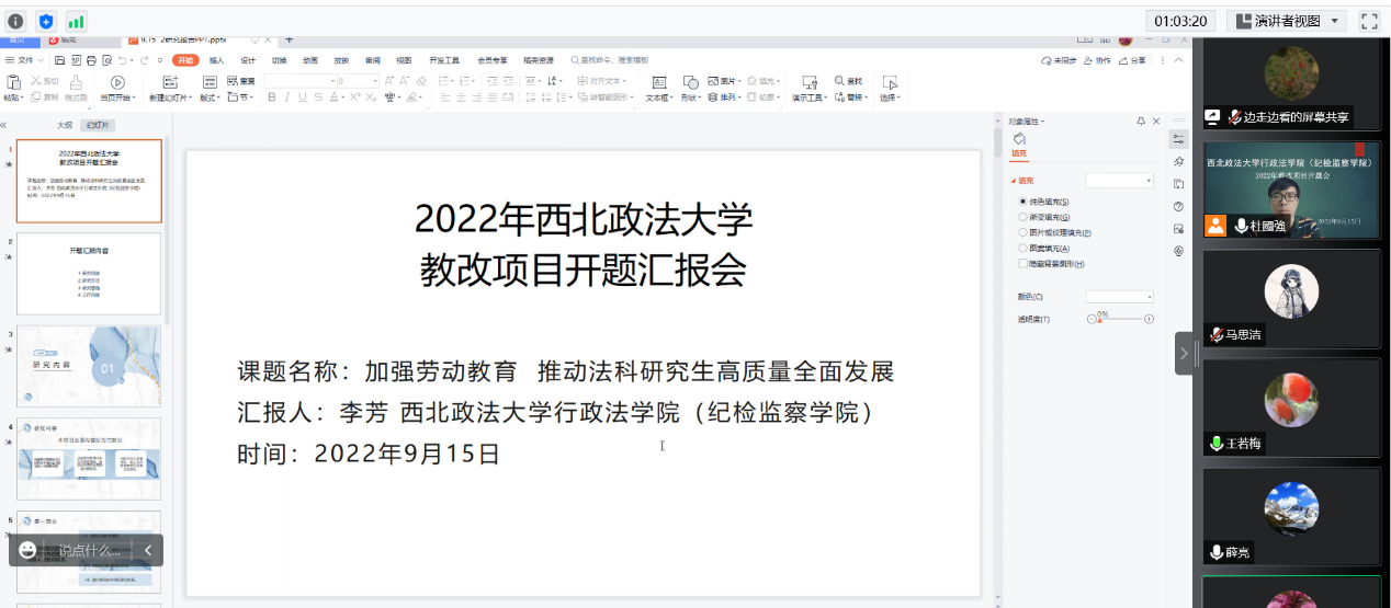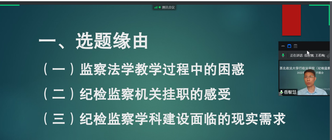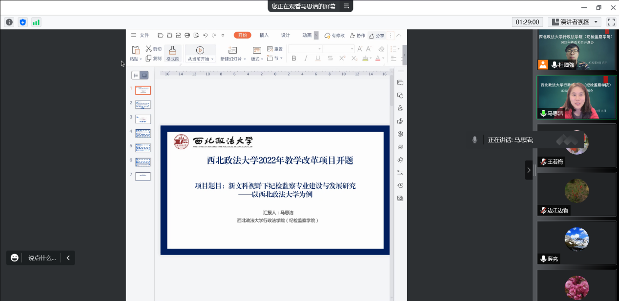 本次校级教改课题的三位负责人学院党委副书记副院长李芳老师、监察法教研室党支部书记岳智慧博士、监察法教研室副主任马思洁博士分别就项目的研究设计、论证质量、预期成果做了简要汇报。与会专家对课题研究的相关问题进行了中肯评议,并提出了建设性的意见与建议。