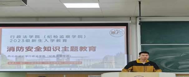 为了增强学生的安全意识,提高学生的自救能力,行政法学院(纪检监察学院)于2023年12月13日晚在aj12教室进行了消防安全知识主题教育讲座,本次主题教育讲座由行政法学院2023级辅导员柴江老师主讲。2023级全体新生参加。