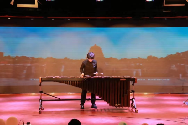 在比赛现场,张晨子炫同学用打击乐器马林巴琴演奏了《欢腾》这一曲目。《欢腾》以欢快的旋律和热烈的气氛,诠释了新中国成立以来人民团结一心、奋发向前的精神风貌,不仅是对新中国取得的辉煌成就的热烈颂扬,也是对中华儿女艰苦奋斗、百折不挠精神的崇高赞颂。马林巴琴以其宽广的音域和独特的音色为这首曲目赋予了丰富的层次感和生动的画面感。