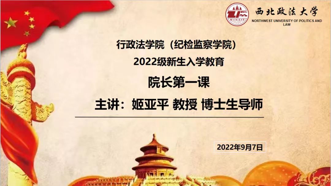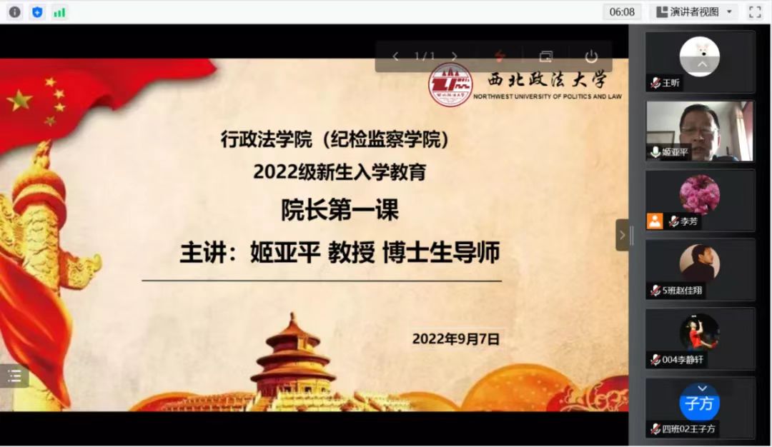金秋九月至,新生入学教育进行时。2022年9月7日上午,行政法学院(纪检监察学院)举办了2022级新生第一场入学教育活动,即“院长第一课”,由学院院长、博士生导师、姬亚平教授主讲。姬亚平以“校史院情与学科专业介绍与学业规划”为主题,通过腾讯会议线上方式,为2022级新生带来了一场精彩的专业讲座。本次活动由行政法学院副书记李芳主持,2022级辅导员王昕以及全体新生参加。