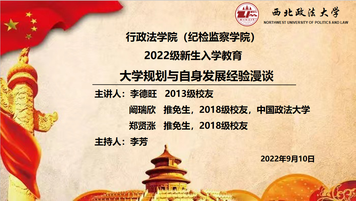 为了激发新生的学习动力和热情,砥砺新生珍惜宝贵的学习时光,引导新生树立正确的学业观,2022年9月10日,赌场 充分发挥优秀校友的榜样引领作用,邀请李德旺、阚瑞欣、郑贤涨三位优秀校友围绕自身的求学经历向大家进行经验分享。本次线上分享会由行政法学院副书记李芳主持,2022级辅导员王昕及学院全体新生参加。