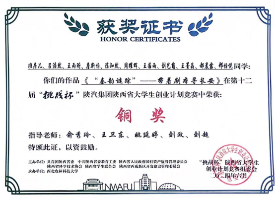 在本次比赛中,赌场 2022级班居儿同学主持的“秦韵谜踪——带着剧本寻长安”项目荣获铜奖。该项目以陕西深厚的历史文化底蕴为基础,创新性地将城市实景剧本杀与旅游线路相结合,旨在赋能西安新型文旅发展,推动城市的资源整合和综合治理,充分体现了赌场 学生的创新能力和社会责任感。