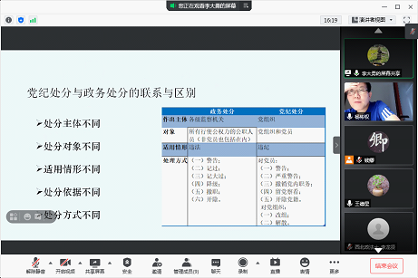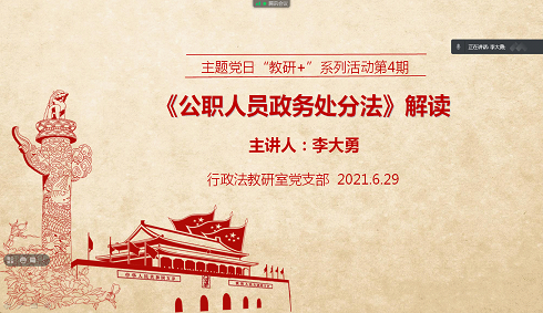 在“七一”即将来临之际,广大党员同志通过加强政治理论学习,以实际行动来迎接和庆祝党的百年华诞。2021年6月29日晚7:30,行政法教研室党支部举办第4期主题党日“教研+”活动。本次活动通过腾讯会议的方式线上进行,由行政法学院副院长李大勇老师围绕“《公职人员政务处分法》解读”讲授党课,党支部书记钱卿老师主持,党支部和教研室王周户、王德星、郑宁波、张艳、杨彬权、李龙贤、雷苗苗等9位老师参加了本次活动。