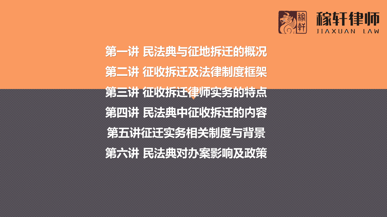 本次讲座以征地拆迁为线索,讲座内容主要包括民法典与征地拆迁的概况、征收拆迁与法律制度框架 、征收拆迁律师实务的特点、民法典中征收拆迁的内容、征迁实务相关制度与背景、民法典对办案影响及政策六个部分。