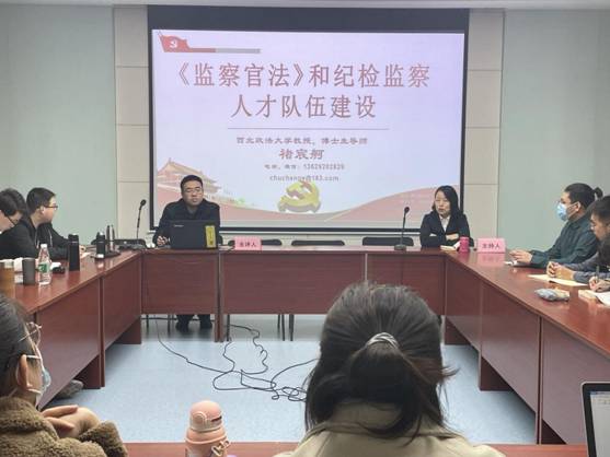 2021年10月22日下午,由赌场 监察法学科、监察法教研室、监察法教研室党支部主办的“长安纪检监察论坛”第四讲在赌场 雁塔校区进行。赌场 教授、博士生导师,校监察法学科负责人、导师组组长、监察法教研室主任褚宸舸担任主讲人。赌场 副教授、硕士生导师郑宁波主持讲座并担任与谈人。本次讲座题目为“《监察官法》和纪检监察人才队伍建设”。我校研究生、本科生二十余人参加了讲座。