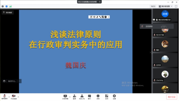 承办。西安铁路运输中级法院魏国庆法官在线上进行了“浅谈法律原则在行政审判实务中的应用”的主题分享。