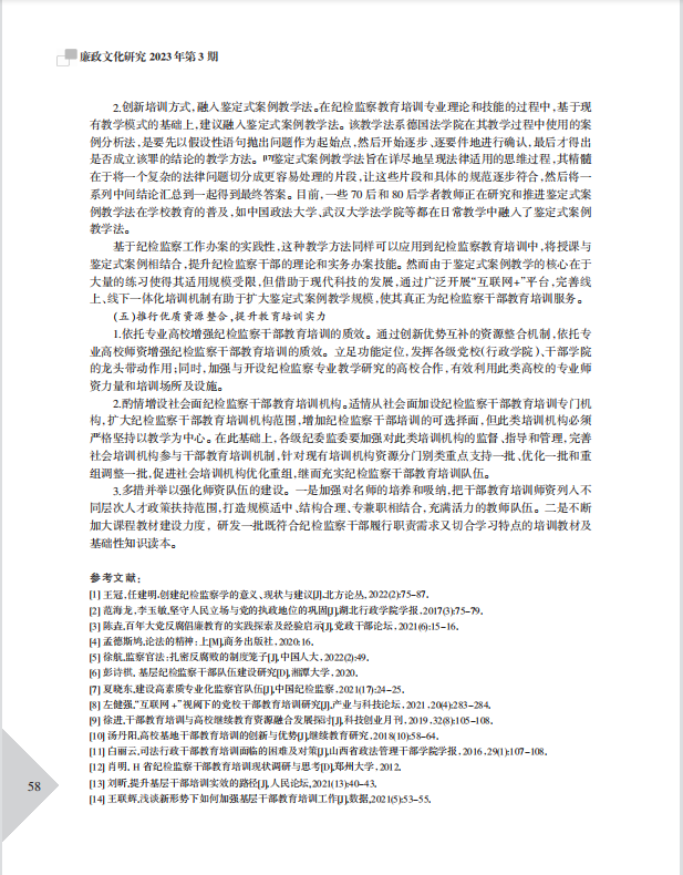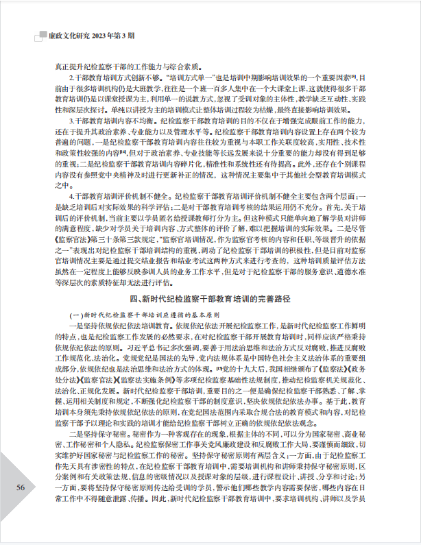 文章基于新时代纪检监察工作要实现高质量发展的大背景,立足当下,分析了新时代党的建设新的伟大工程呼吁高素质纪检监察干部队伍、《监察官法》提高了纪检监察干部教育培训的定位、科技赋能推动纪检监察干部教育培训的多元化成为可能等重大机遇;文章也指出了纪检监察干部教育培训仍面临管理体制不顺畅、讲授体系不完善、资源整合不足、教学方式单一等挑战;结合教学和培训工作经验,提出通过完善管理体制、融入鉴定式案例教学等创新方式,完善干部教育培训讲授体系,整合优质培训资源等路径解决实际工作中的难点疑点,继而锻造高素质专业化纪检监察铁军的建议。