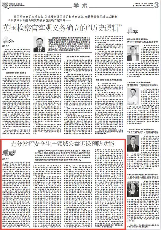 《检察日报》2023年7月22日刊发我校检察公益诉讼研究中心李瑰华的文章《充分发挥安全生产领域公益诉讼预防功能》,该文系“陕西省推进行政公益诉讼重点难点问题研究”项目的阶段性成果。