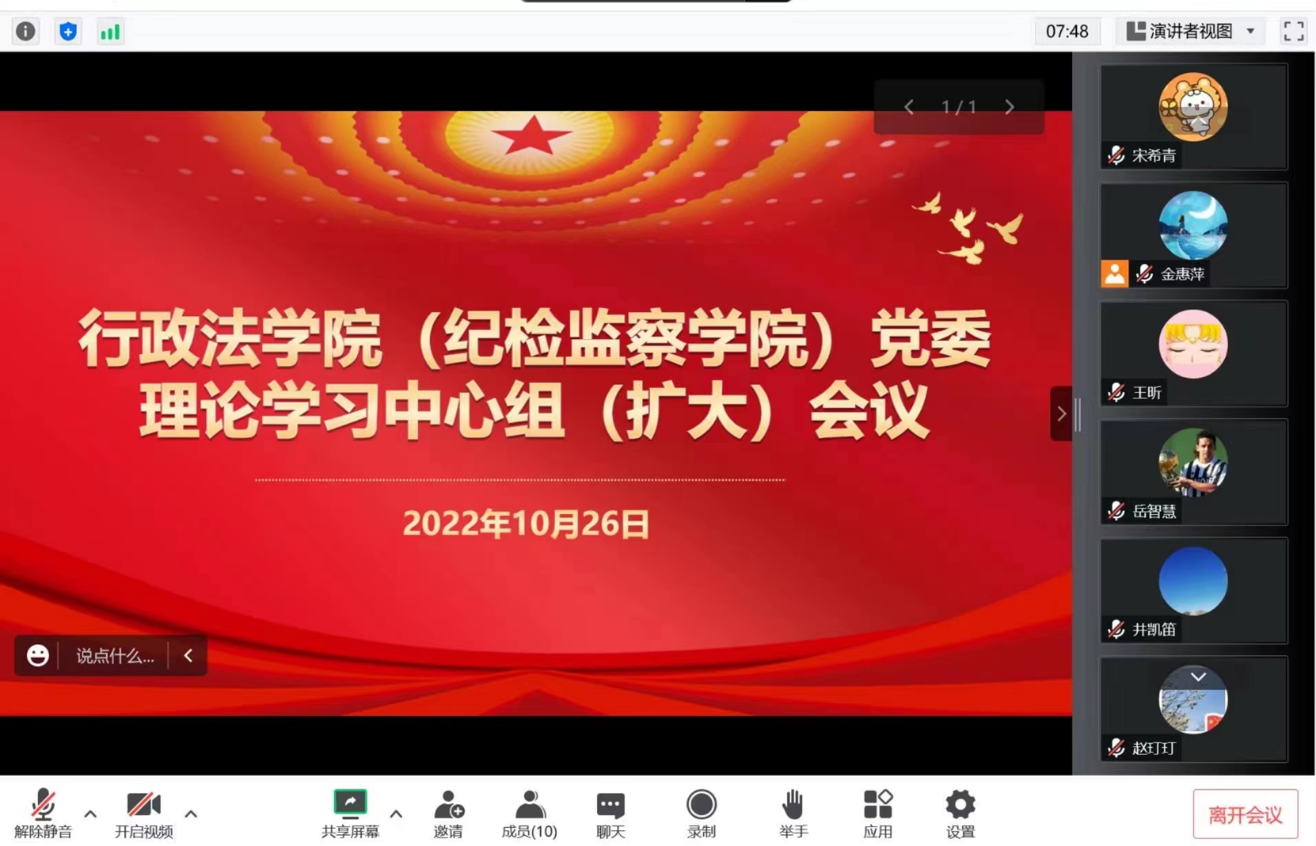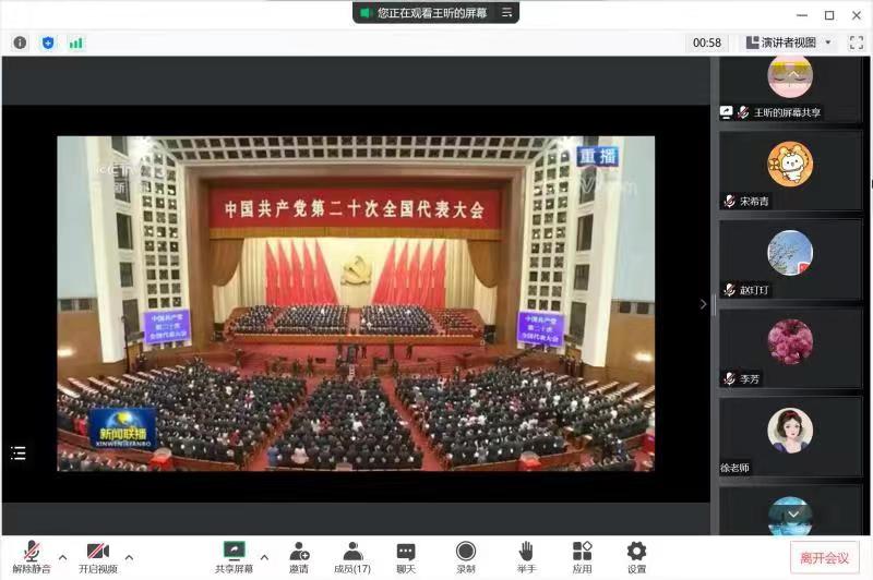 在线上召开党委理论学习中心组(扩大)会议,专题学习中国共产党第二十次全国代表大会精神。学院班子成员、党支部书记、行政干部及全体辅导员参加学习。学院党委书记赵玎玎主持会议。