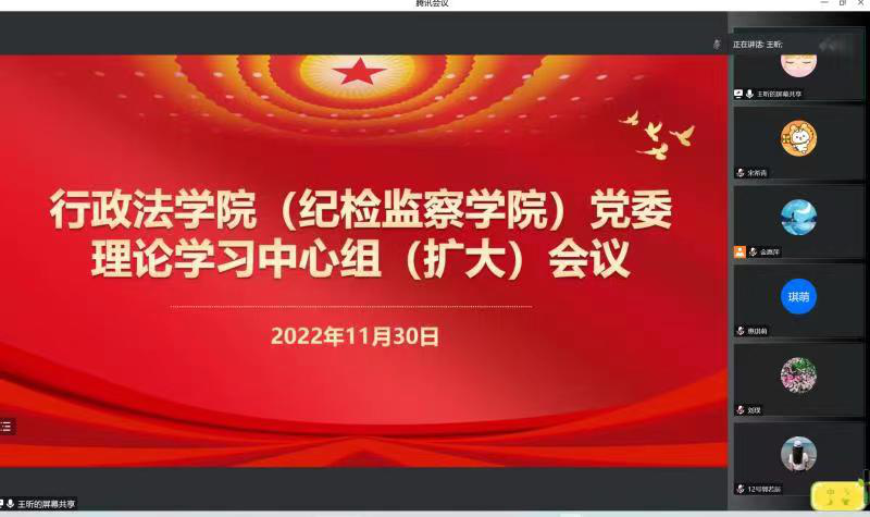11月30日下午,行政法学院党委(纪检监察学院)召开理论学习中心组(扩大)会议,以线上线下相结合的方式集中学习《党章》和《习近平谈治国理政》第四卷等内容。学院班子成员、党委委员、党支部书记、组织员参加学习。学院党委书记赵玎玎主持会议。
