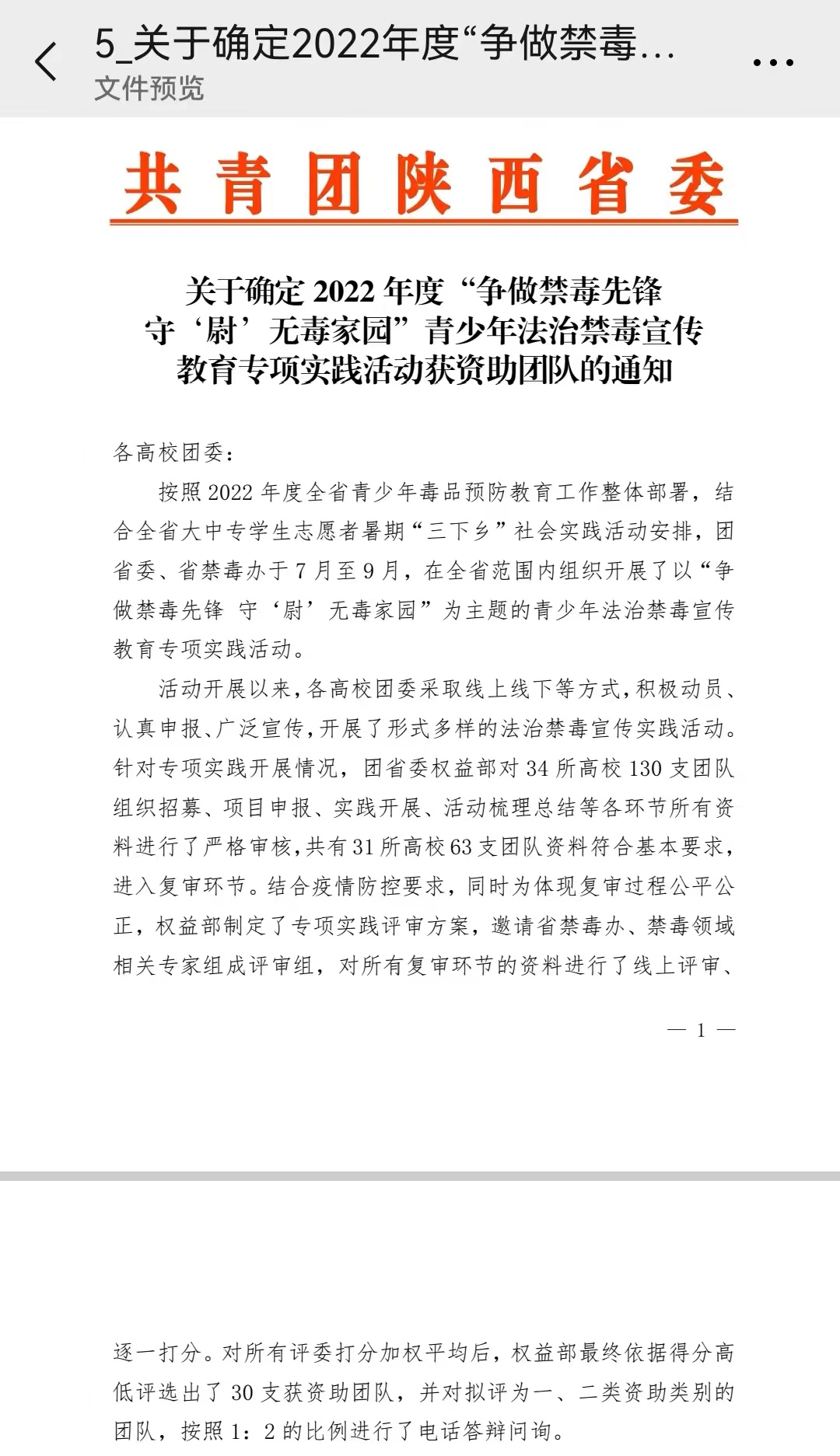 该团队经由学校团委推荐,参加共青团陕西省委2022 年度“争做禁毒先锋 守‘尉’无毒家园”青少年法治禁毒宣传教育专项实践活动的项目申报,实践开展、活动梳理总结,以及项目评审、复审,最终获得资助团队。