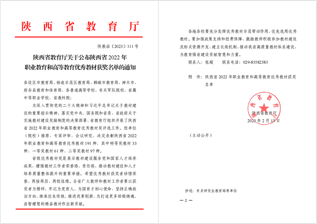 近日,陕西省教育厅印发《关于公布陕西省2022年职业教育和高等教育优秀教材获奖名单的通知》(陕教函〔2023〕111号),赌场
