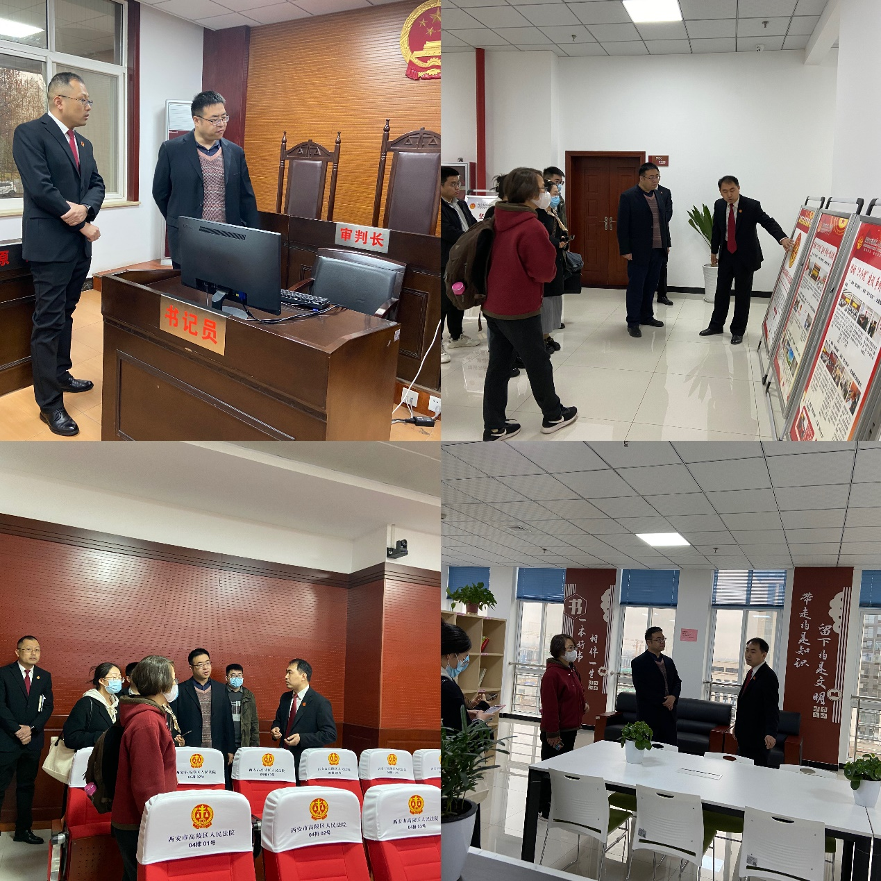 师生首先参观了高陵区人民法院泾渭法庭,在法庭和法官进行座谈。然后赴法院本部参观了各类型诉调对接工作室、图书室、党建工作室、执行指挥中心、审判庭等场所。
