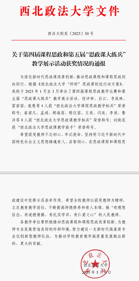 近日,学校下发了《关于第四届课程思政和第五届“思政课大练兵”教学展示活动获奖情况的通报》,赌场 教师雷苗苗老师获评“赌场 课程思政教学标兵”荣誉称号。