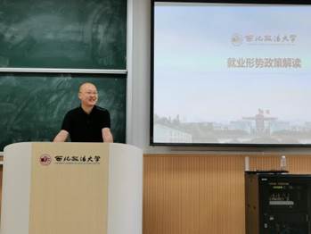 杨军老师从当下的就业形势、就业政策以及如何应对就业形势等方面展开了就业辅导报告。杨老师还结合学校和学院近年就业调研数据,帮助大家分析当前就业形势、总结常见问题,向同学们介绍了就业信息的获取途径和需提升的就业能力,为同学们做了详细的职业规划和求职指导。