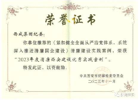 近日,西安市纪委监委组织开展清廉西安建设优秀实践案例评选活动赌场 姬亚平教授及其团队与西咸集团合作的《紧扣健全全面从严治党体系 系统深入推进清廉国企建设》获评“2023年度清廉西安建设优秀实践案例”