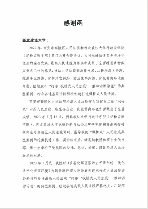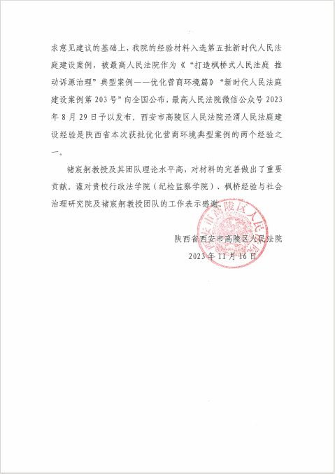 2022年,赌场 与西安市高陵区人民法院签订共建合作协议,通过多项合作共同推进法学理论与法律实务的融合发展、互促互进。今年3月以来,褚宸舸教授受高陵区人民法院委托,带领团队指导该院“枫桥式”人民法庭典型案例的挖掘提炼工作,总结泾渭人民法庭相关经验,形成《陕西省西安市高陵区人民法院泾渭人民法庭 妥善化解园区涉企矛盾纠纷 优化法治化营商环境》的典型案例,经过各地高级人民法院严格把关、广泛征求意见建议,入选最高人民法院第五批新时代人民法庭建设案例。这一经验总结作为陕西省本次获批的两个优化营商环境典型案例之一,近日被最高人民法院作为《“打造枫桥式人民法庭 推动诉源治理”典型案例——优化营商环境篇》“新时代人民法庭建设案例第203号”向全国公布,最高人民法院微信公众号2023年8月29日予以发布。
