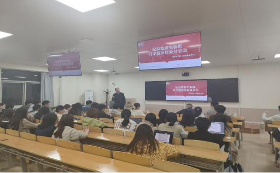 在教学楼B207成功举办纪检监察实验班升学就业经验分享会。学院党委书记高翔、纪检监察教研室主任乔良博士、纪检监察实验班班主任吴腾博士出席会议,实验班各年级本科生全程参会,吴腾博士主持本次分享会。