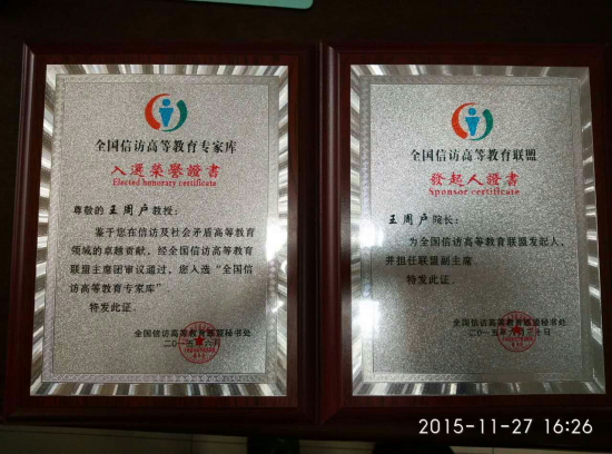 我校行政法学院王周户院长为全国信访高等教育联盟发起人,并担任联盟副主席。同时行政法学院的姬亚平教授、李瑰华教授、李大勇副教授、彭涛副教授、杜国强副教授、安子明副教授等7位老师入选“全国信访高等教育专家库”。