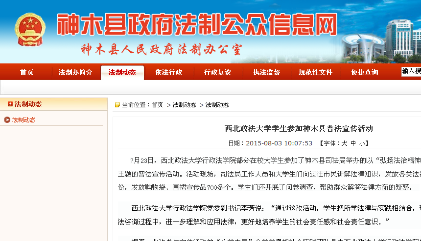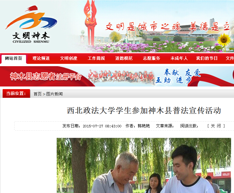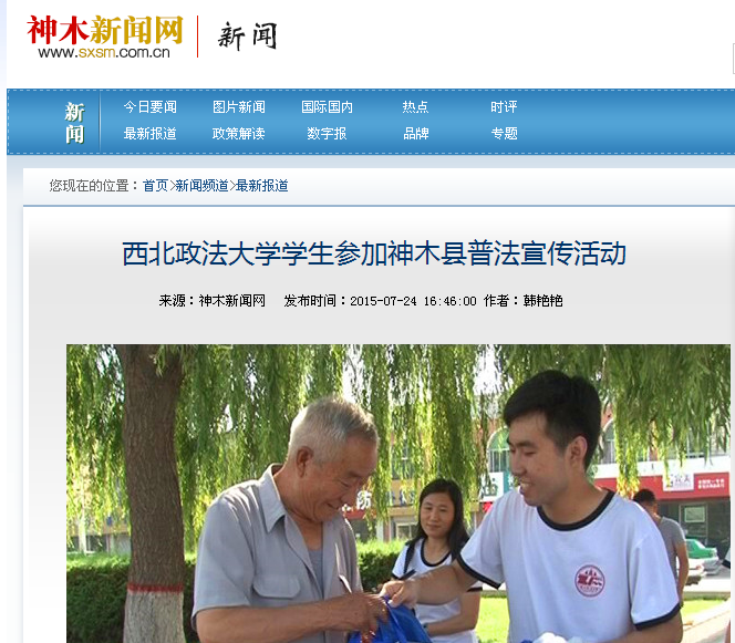 暑期社会实践团队带队老师李芳,实践团队全体成员,以及神木县司法局赵永强副局长,司法工作人员等共20余人,在神木县迎宾广场,进行普法宣传活动。本次活动受到当地媒体的高度关注,神木县广播电视台和神木新闻网等当地多家媒体进行报道。