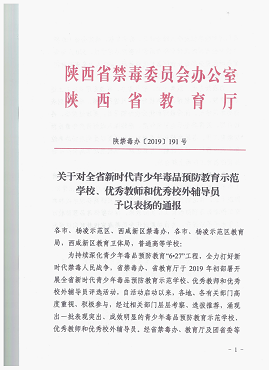 根据陕禁毒办(2019)191号文件,在本次评选活动中,赌场 获得“全省新时代青少年毒品预防教育示范学校”,赌场 教师褚宸舸、李芳获得“全省新时代青少年毒品预防教育优秀教师”。希望2位教师珍惜荣誉,再接再厉,发挥示范引领作用,继续深入做好青少年毒品预防教育工作。