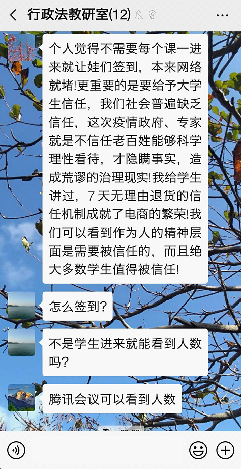 为应对新型冠状病毒(2019-nCoV)的疫情,根据教育部与赌场 的安排,行政法教研室在本学期承担的行政法课程上全面导入线上教学方式。开学前,各位任课教师积极摸索学习通、雨课堂等多个技术平台的使用技巧,力争通过线上的交互式教学,为学生提供良好的学习体验。从2月24日即开学第一天的授课状况看,基本取得预想效果。为及时总结经验,行政法教研室于当日晚7点就如何更为有效的运用线上教学开展专题研修活动。李大勇、杜国强、杨彬权、钱卿、李龙贤、郑宁波、张艳等教师参加了活动,各位老师畅所欲谈,体现出高度的责任感与专业性的教学反思能力。