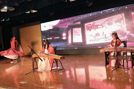 2020级丁欣雨、白毛毛、赵芷仪带来的古筝舞蹈《长安姑娘》,琴音、舞蹈,古典乐舞之间转瞬梦回长安——那个杨花落尽的夜,青砖黛瓦,子规啼。