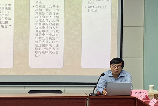2021年5月26日晚7时,行政法教研室党支部第3期主题党日“教研+”活动在雁塔校区人权研究中心会议室活动举行。本次活动围绕习近平总书记2018年8月24日的讲话“坚持以全面依法治国新理念,新思想、新战略为指导,坚定不移走中国特色社会主义法治道路”主题学习,以新《行政处罚法》为内容进行集体备课,由教研室党支部书记钱卿老师领学,教研室主任杜国强副教授主持。王周户教授、贡世康教授、王德星副教授、李大勇教授、张艳博士、雷苗苗博士、杨彬权博士、李龙贤博士等教研室老师到会。西安铁路运输法院副院长赵新等多名法官、律师以及研究生30余人参加本次活动。