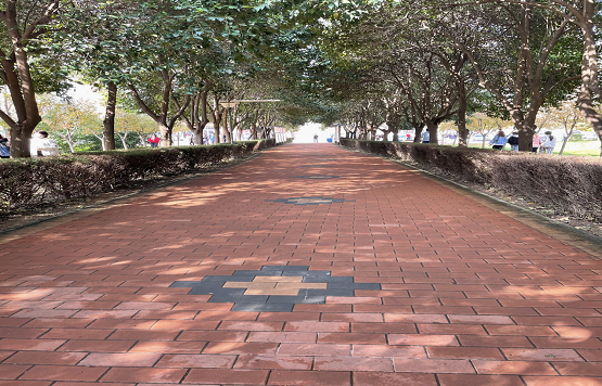 光透过树叶照射在清洁后的地面上,使人的心情感到愉悦和舒适,零零散散的光线,整洁亮堂的地面,使这条小路充满了历史的厚重感和神秘感。