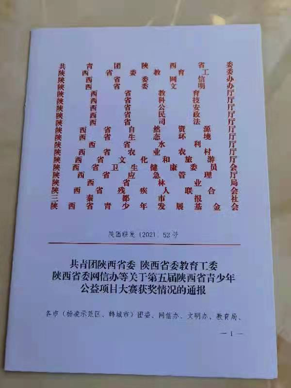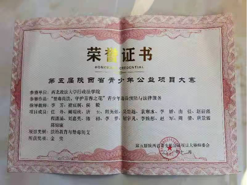 近期,接陕团联发(2021)52号文件,我校校团委推荐、行政法学院申报的公益禁毒普法宣传项目——“禁毒尚法、守护青春之花---青少年毒品预防与法律服务”项目,荣获第五届陕西省青少年公益项目大赛金奖。