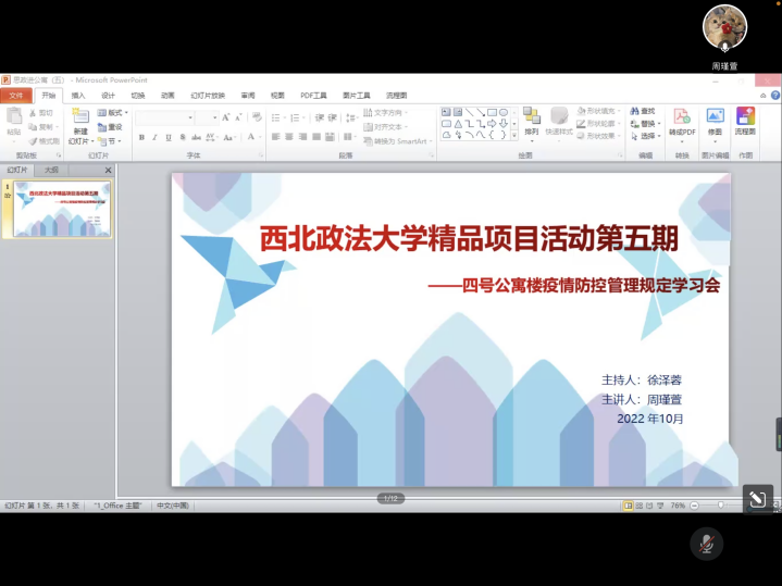 学生工作精品项目活动第五期——四号公寓疫情防控管理规定学习会在线上举行,会议由经济学院辅导员周瑾萱主讲,行政法学院辅导员徐泽蓉主持,四号公寓全体楼层长、舍长及行政法学院2019级全体学生参加。
